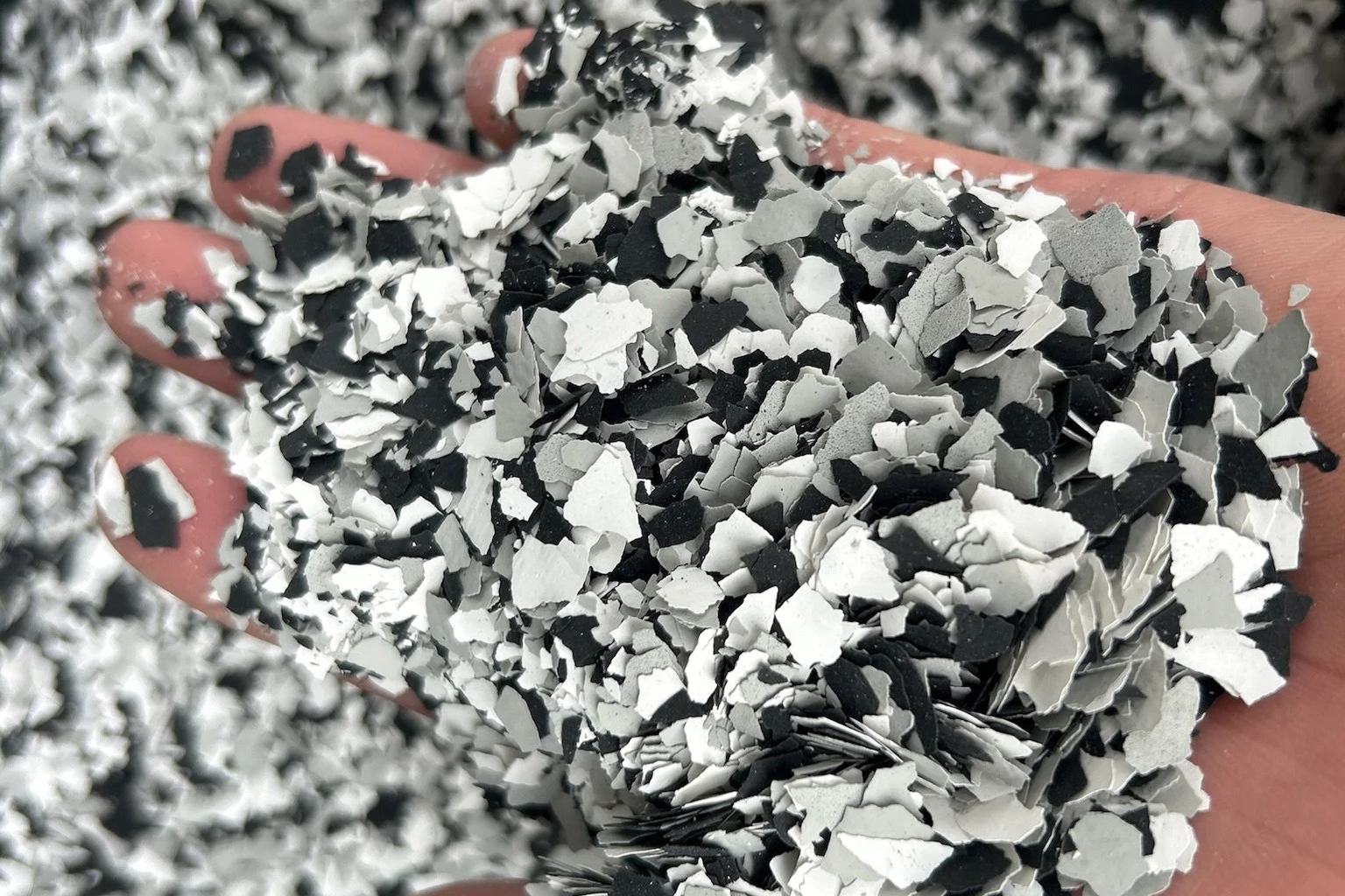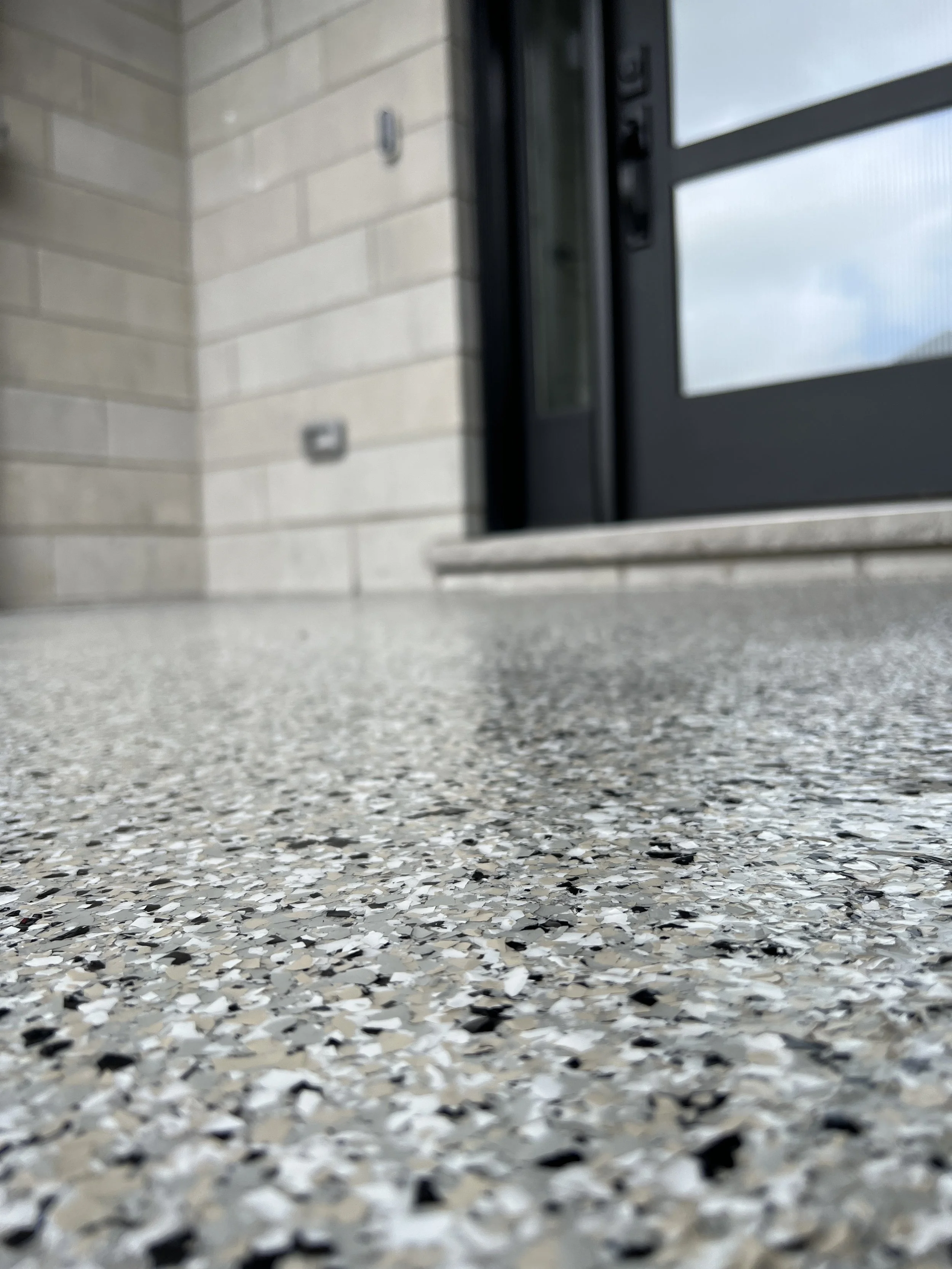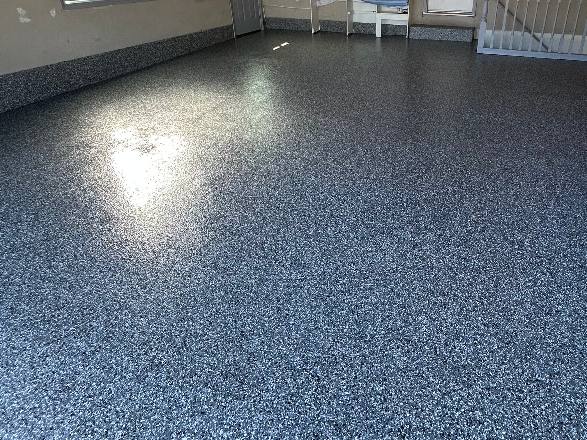 A full flake broadcast is applied to the uncured epoxy layer. Once cured, excess flake is scraped and vacuumed to reveal a flawless layer ready for the final coat.